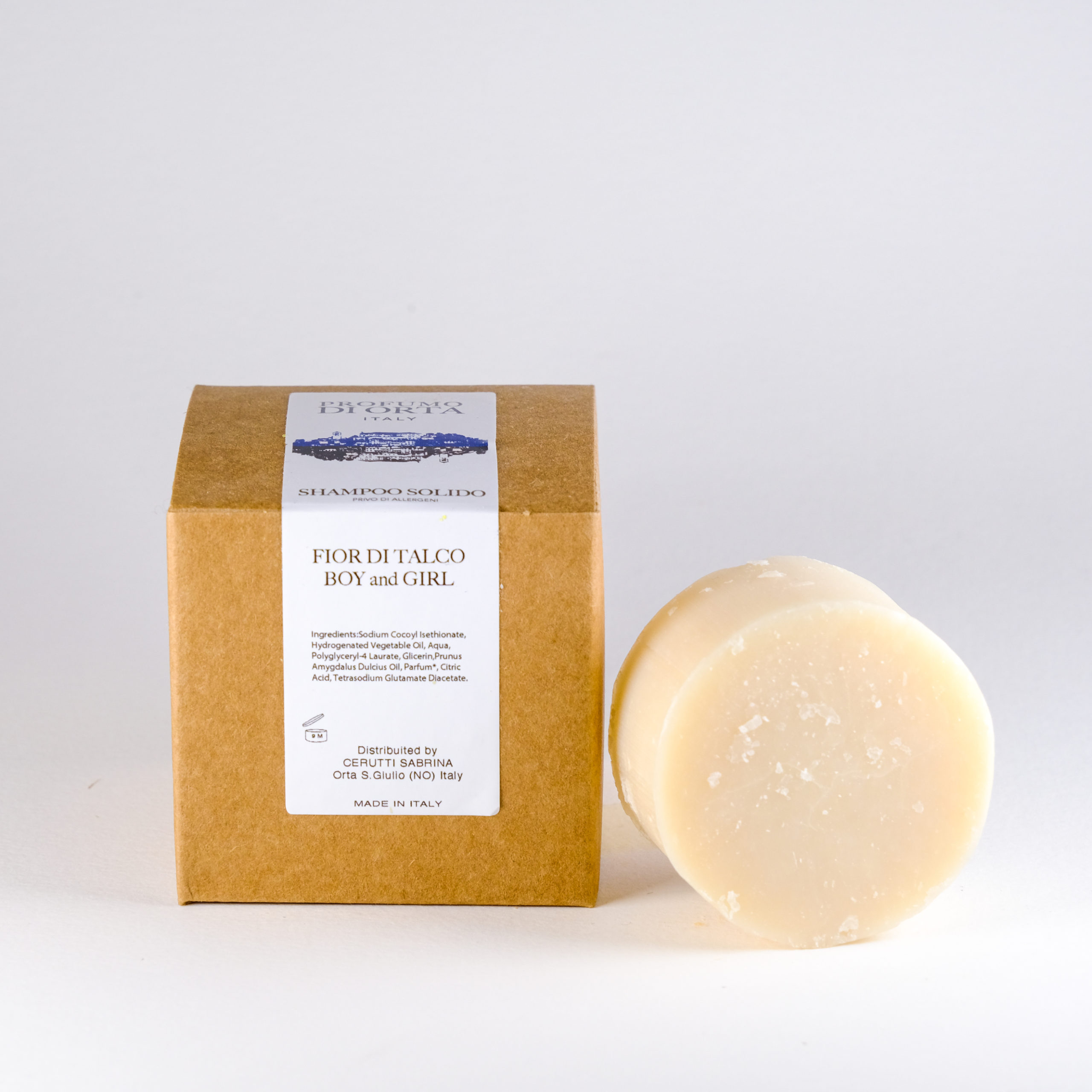 Shampoo solido Baby al Fiore di Talco. Per utilizzarlo basta sfregare lo shampoo tra le mani, spalmare sui capelli bagnati, e risciacquare dopo l'uso.